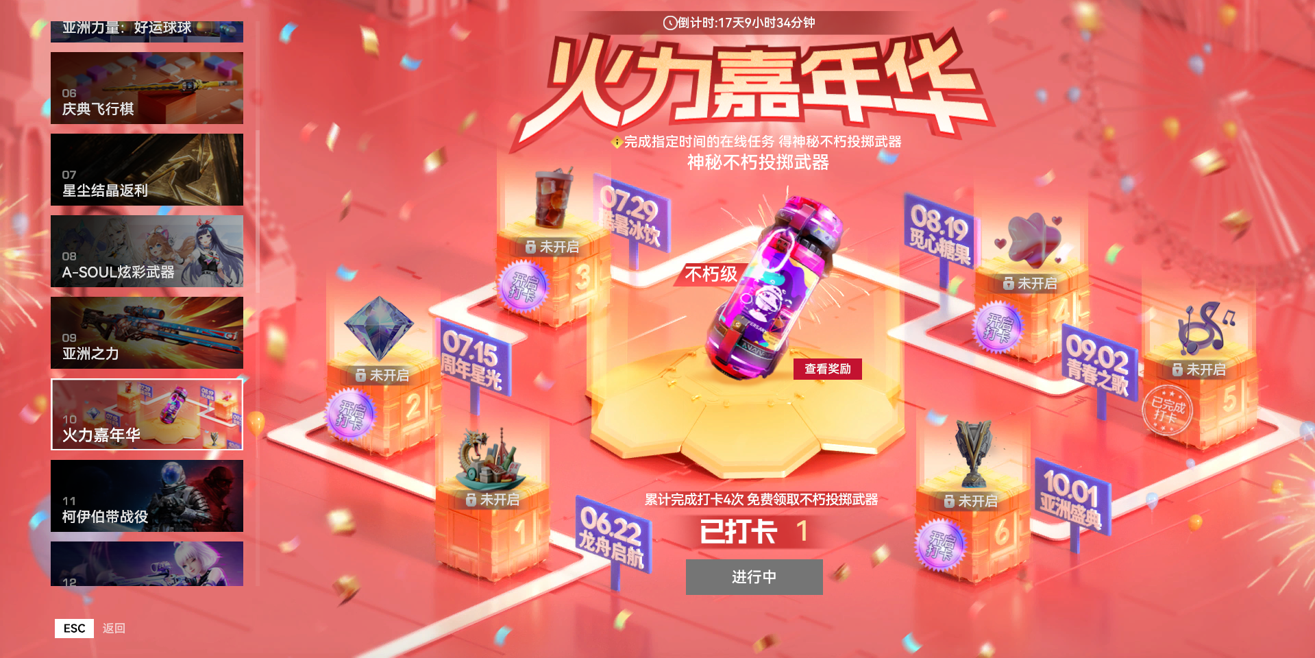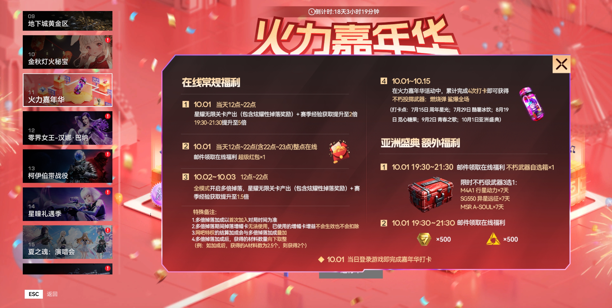节日限定重磅活动『火力嘉年华:亚洲盛典』将在10月1日正式启动,活动期间不同时间段完成相关任务即可解锁对应奖励,除常规嘉年华奖励外还可得『亚洲盛典』额外福利,更有诸多版本活动来袭!
